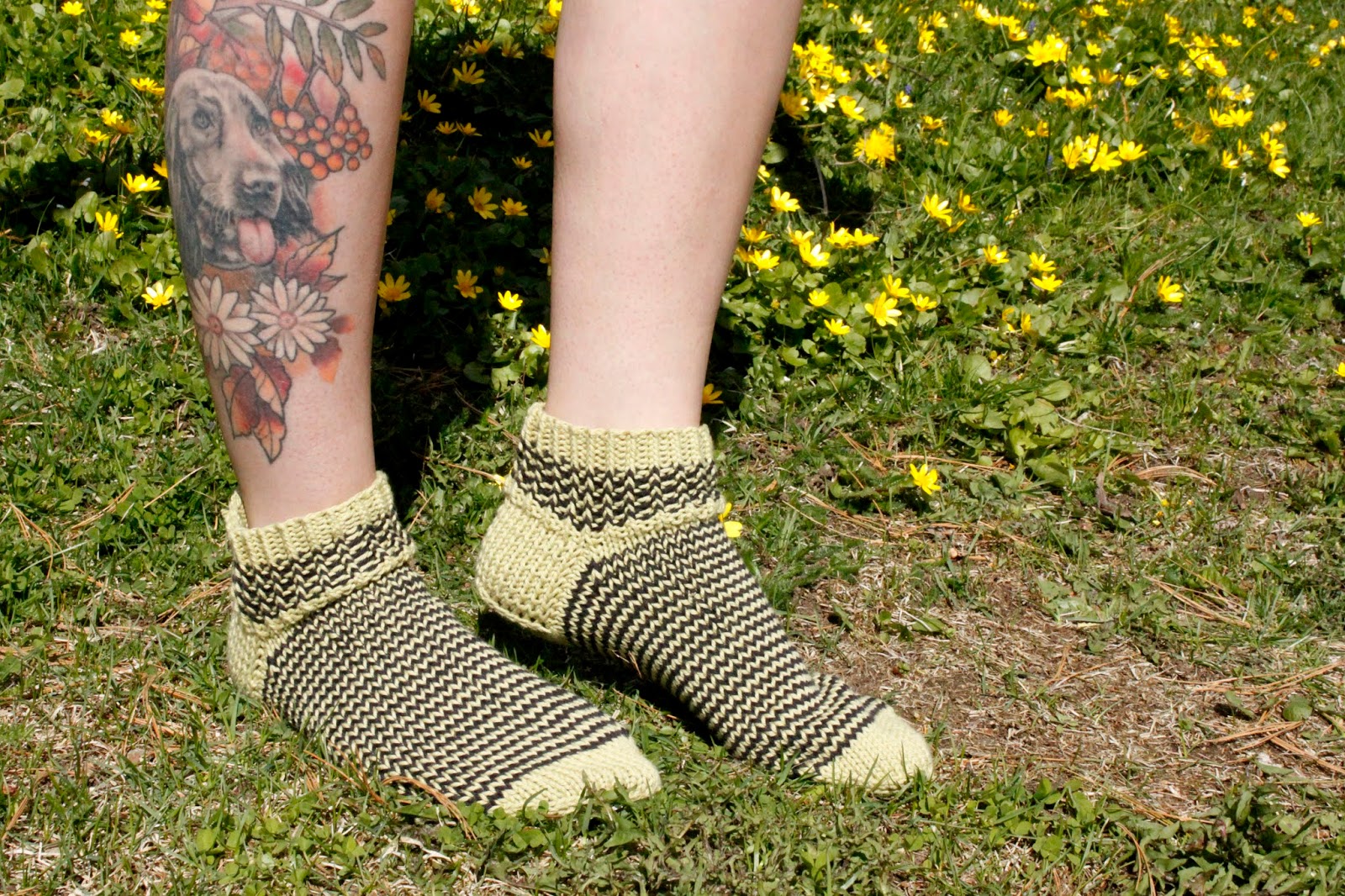 [ENG] We have had really nice spring weather already, but this week it started to snow again. We are still sure the summer will arrive 😊 Meanwhile you can knit these socks made of cotton. They are lighter than woollen ones, and not so irritable as woollen can be. And of course they are just perfect as sleeping socks! Stripes are easy to make and design variations are endless.